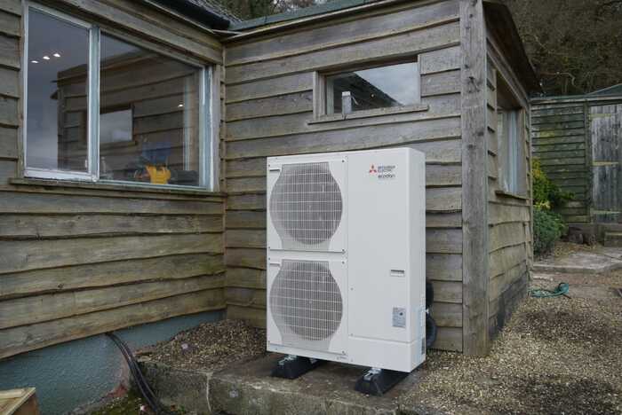 Mitsubishi 11.2KW Ecodan Air Source Heat Pump and Mitsubishi 210L FTC5 Cylinder installed in this three bedroom property near Charmouth, Dorset.
